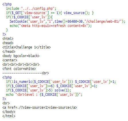 PHP 소스 코드가 보이네요. 중요한 부분은 아래 부분입니다. user_lv 쿠키의 값이 5보다 크면 solve(1) 함수를 호출하는 것으로 보아 저 부분을 실행시키면 될 것 같네요. 하지만 6 이상일 경우 1로 초기화되기 때문에 5보다 크고 6보다 작은 5.5 같은 값을 넣어주면 될 것 같습니다.