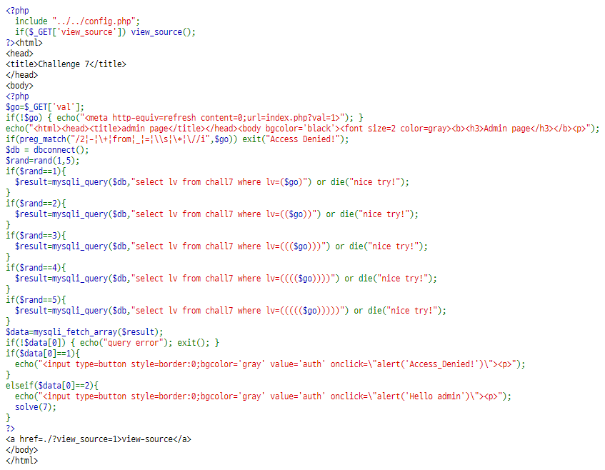 PHP 소스 코드와 SQL 쿼리문이 보이네요. 이번 문제는 SQL Injection 문제인 것 같습니다. GET 방식으로 val 파라미터에서 값을 얻어온 뒤 preg_match 함수로 정규식을 이용해 필터링을 하네요. 그 아래에선 랜덤으로 5가지의 쿼리문 중 하나를 선택해 쿼리를 보내고, 결과가 2이면 문제가 풀리는 것 같군요.